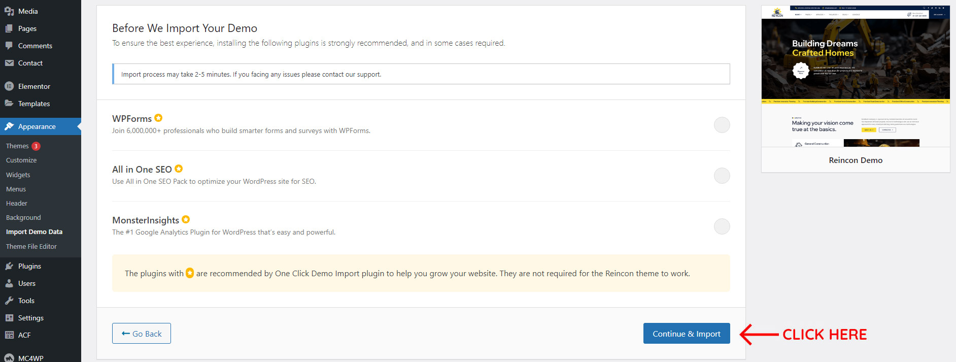 - Now process for the theme setup wizard to install plugins and demo data.
