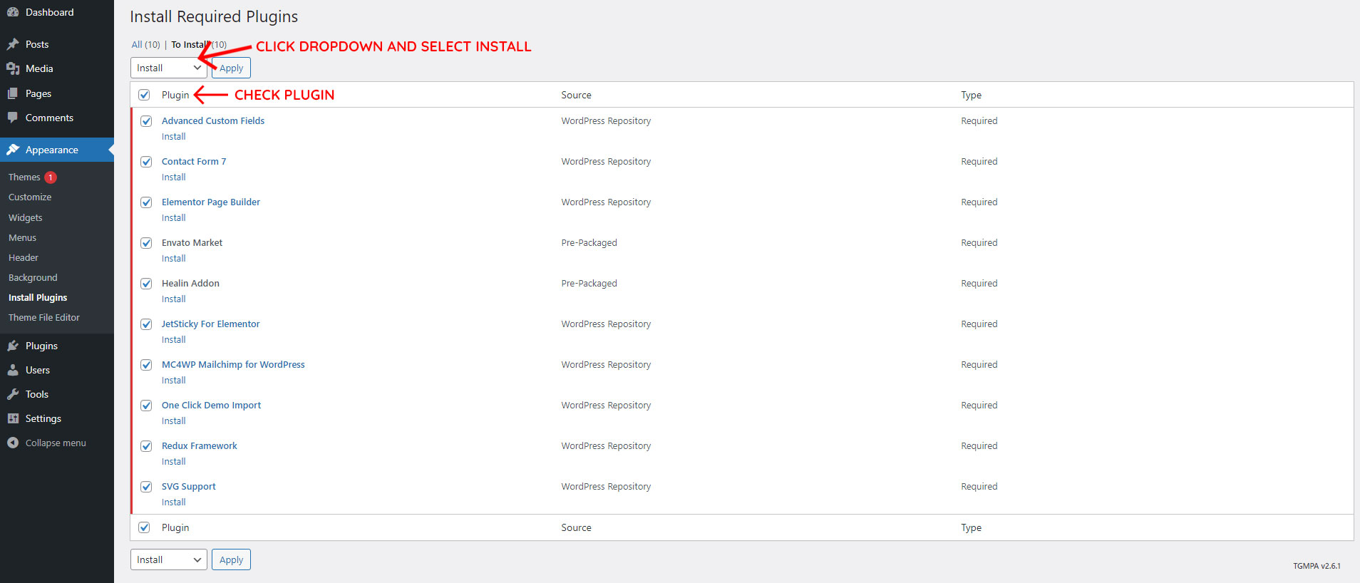 - go to the bottom and select Install from select box